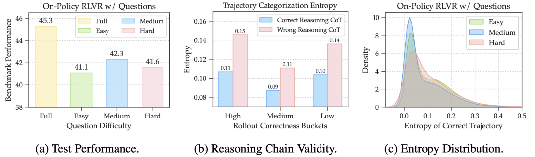 图2:模型经验=问题+对应推理过程。什么才是“好问题”和“好推理过程”? (a) 使用中等难度问题训练的模型性能最佳。(b) 逻辑正确的推理过程通常表现出更低的熵值。 (c) 中等难度推理正确的熵值也更密集于低熵值区域。