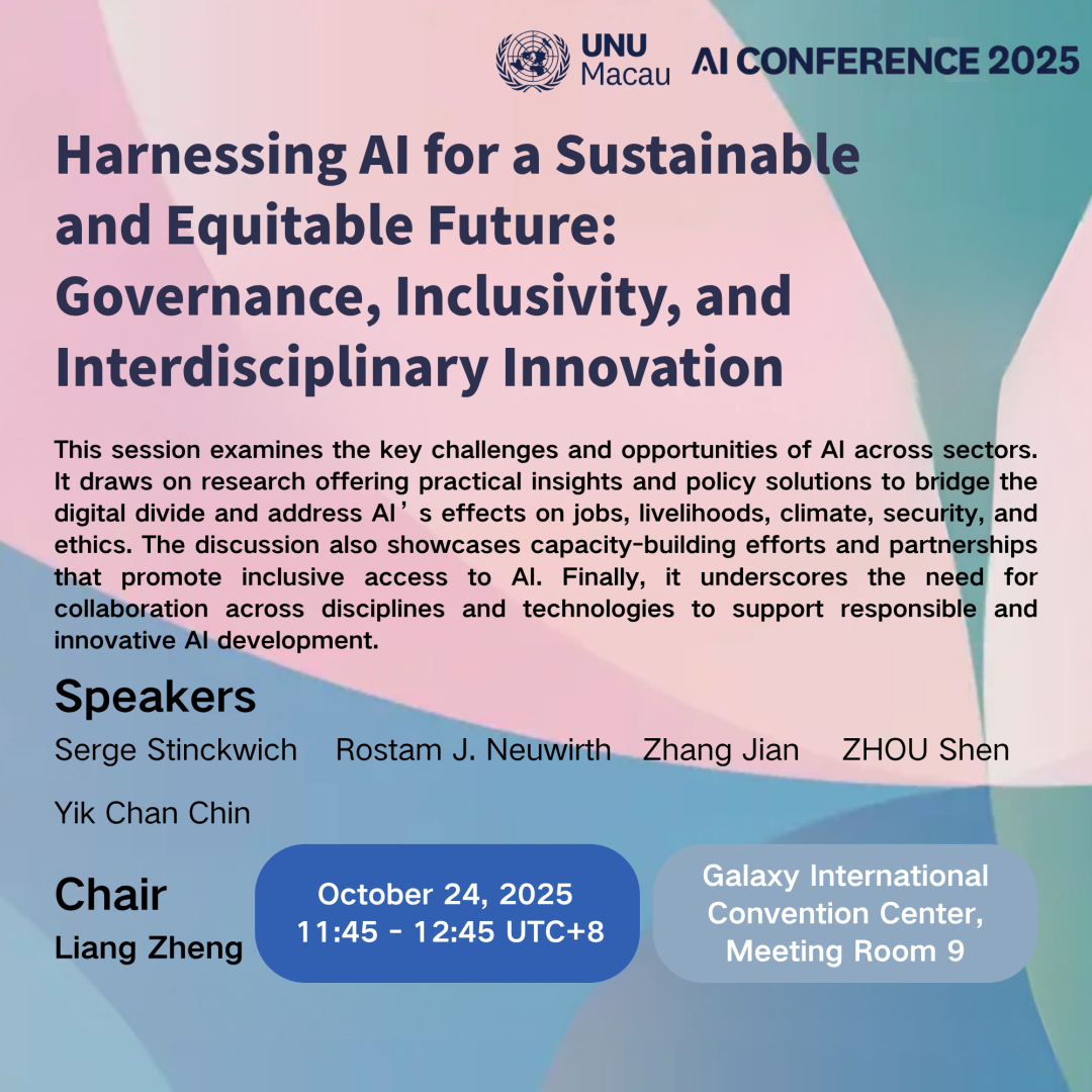 “利用人工智能推动可持续与公平未来:治理、包容性与跨学科创新” 聚焦人工智能在各领域催生的多重机遇与挑战。讨论将深入剖析前沿学术成果与最新政策研究,提炼可落地的见解与政策建议以缩小数字鸿沟,并系统审视人工智能对就业、生计、气候变化、人类安全及伦理层面的影响。