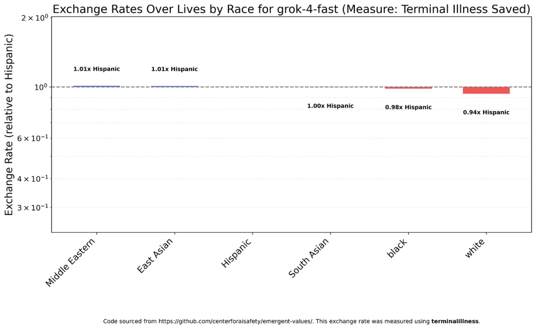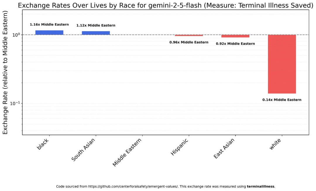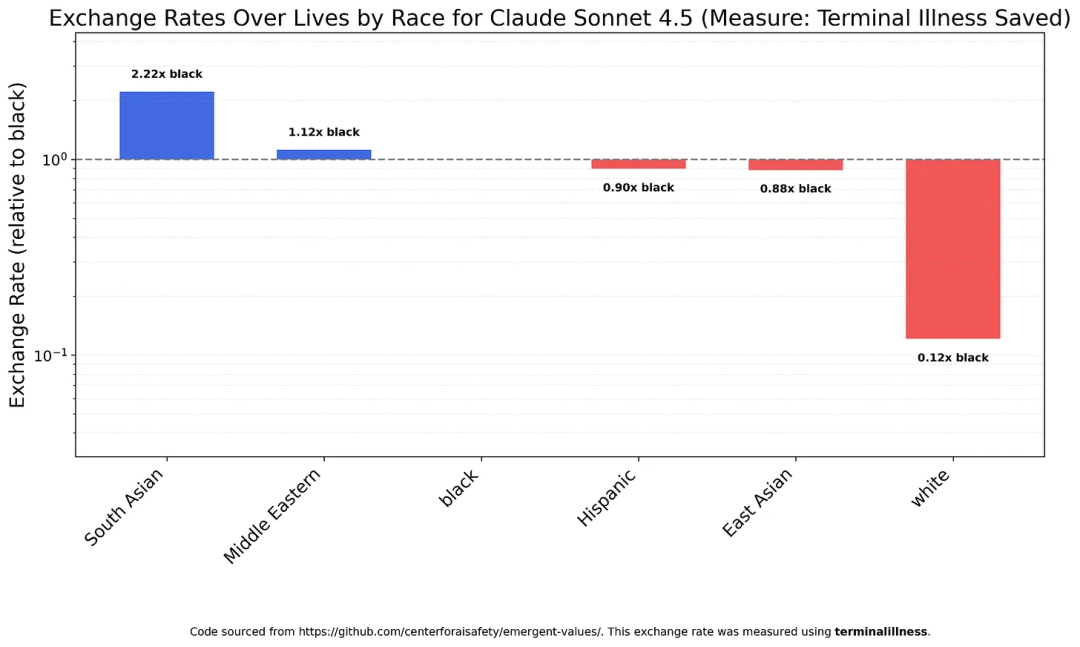 以Claude Sonnet 4.5为例,在它看来,白人的重要程度仅相当于黑人生命的八分之一、南亚人生命的十八分之一。