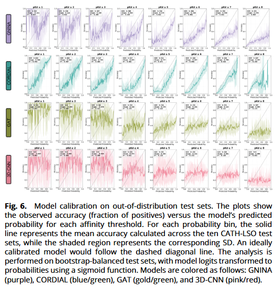 在 CATH-LSO 上,传统打分在低阈值区间校准差;GAT/3D-CNN的概率–准确率曲线近乎扁平,难以作为真实概率解读。CORDIAL 在 pKd ≥1–6 的阈值段呈接近对角线的线性关系,仅在更高阈值(≥7, ≥8)出现过置信/压缩现象,但总体仍显著优于对照。这与其按阈值独立学习的训练策略及物理归纳偏置一致。