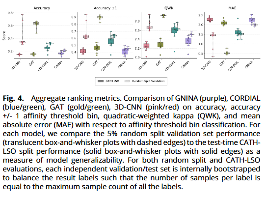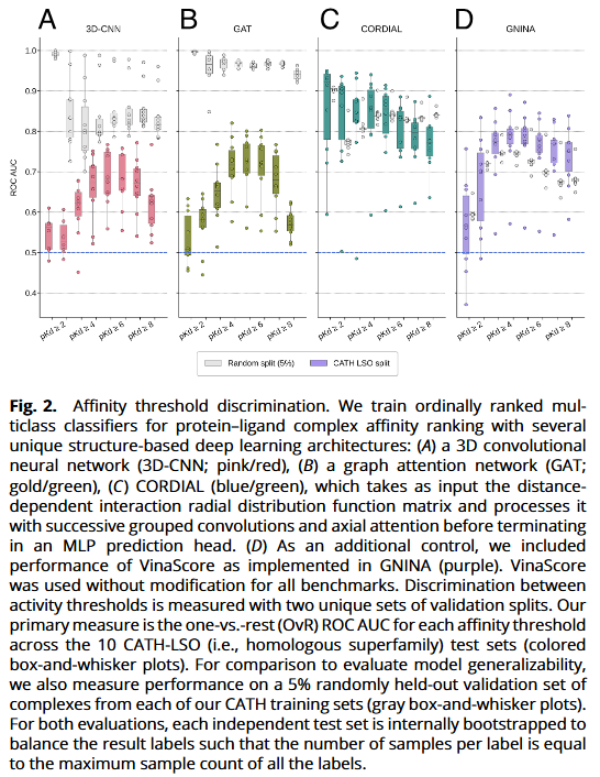 训练与验证:以序等级分类范式训练(每个阈值独立二分类损失),并在随机 5% 验证与CATH-LSO两套切分下评估;与典型 3D-CNN、GAT(图注意力)及传统打分基线对比。