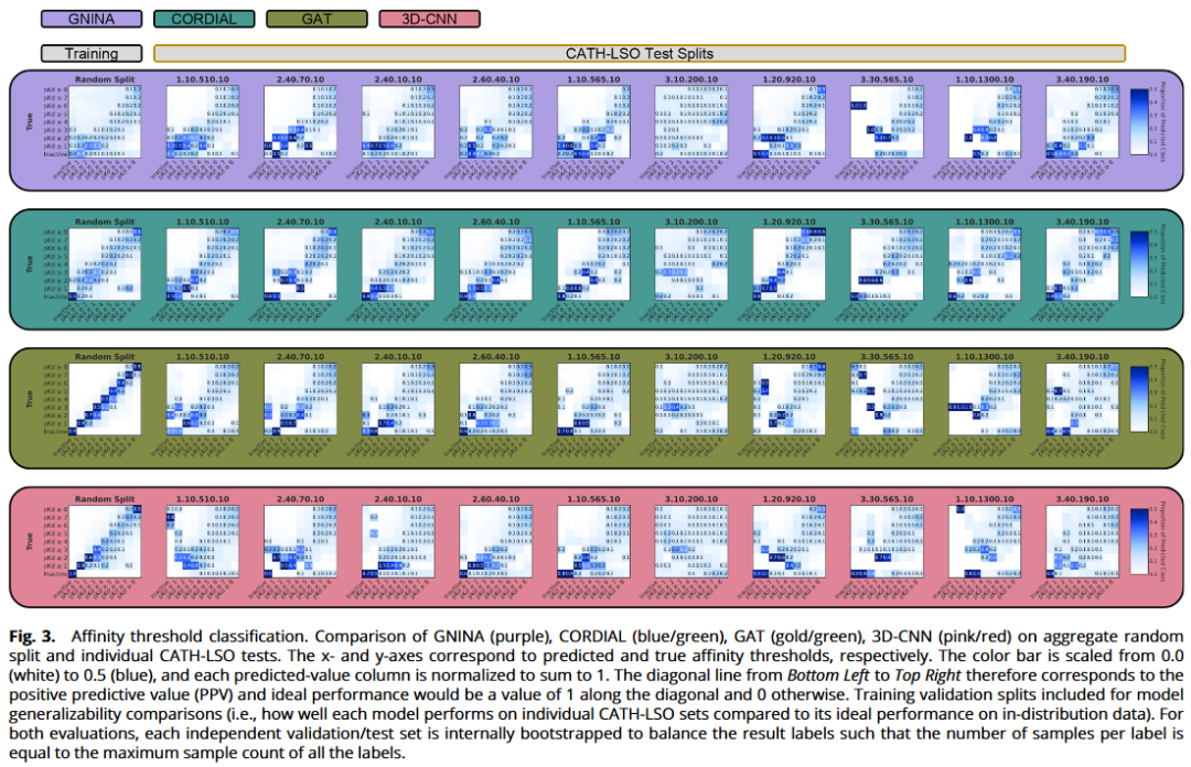 从归一化混淆矩阵看,随机分割下三类深度模型均呈对角主导;但在 CATH-LSO 上,GAT/3D-CNN出现更多偏离对角的误判;而 CORDIAL 在多数 LSO 组上仍保持更清晰的对角带。