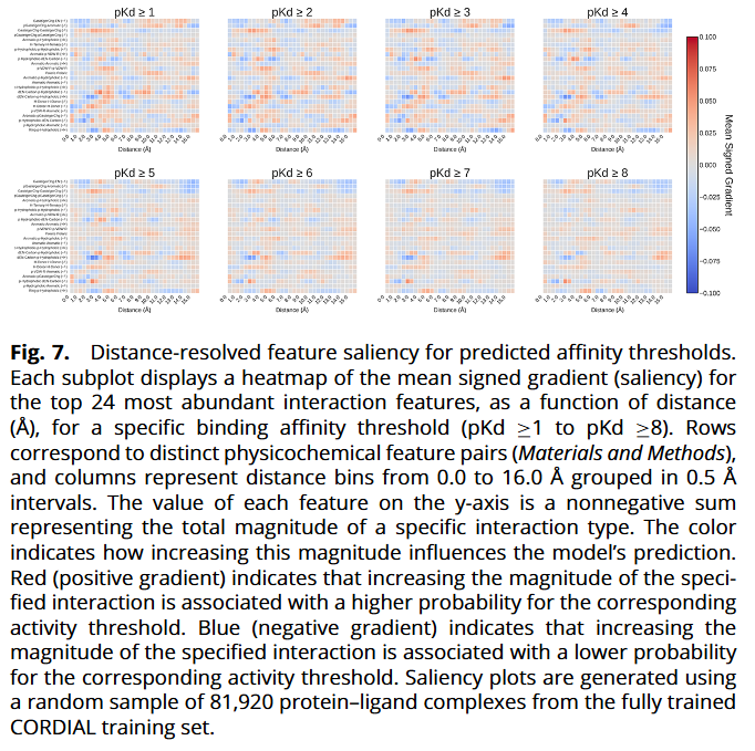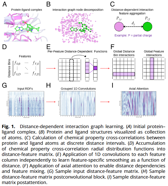 表示与特征:CORDIAL 不直接编码化学拓扑或三维坐标,而是对蛋白-配体原子对在 0–16 Å 距离范围内的物化属性交叉相关进行分箱累计,构成“相互作用径向分布函数(RDF)矩阵”(64×64:距离×特征)。特征覆盖带电/极性、氢键、疏水/芳香、范德华/极化等对偶组合,并区分同号/异号等物理方向性。