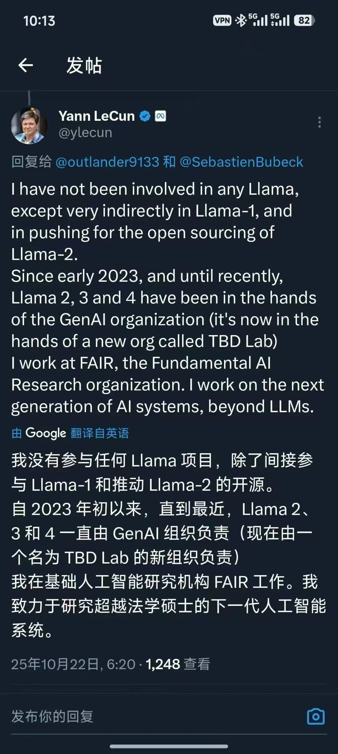 「我没有参与任何Llama项目,一直由其他团队负责,我主要是研究超越LLM的下一代人工智能。」
