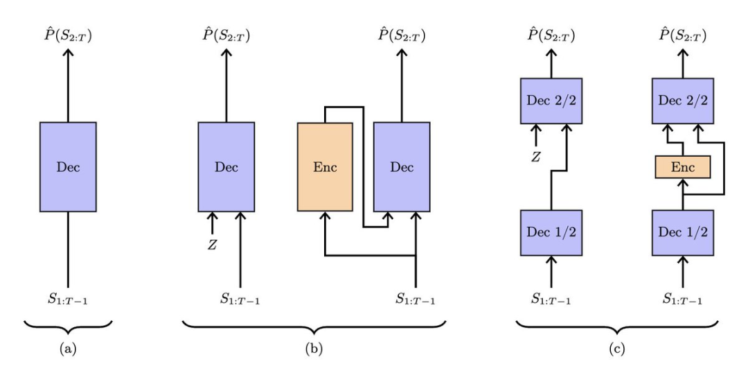 第二个架构增加了随机状态Z,并在训练时使用额外的编码器网络来推断每个样本对应的隐藏状态。