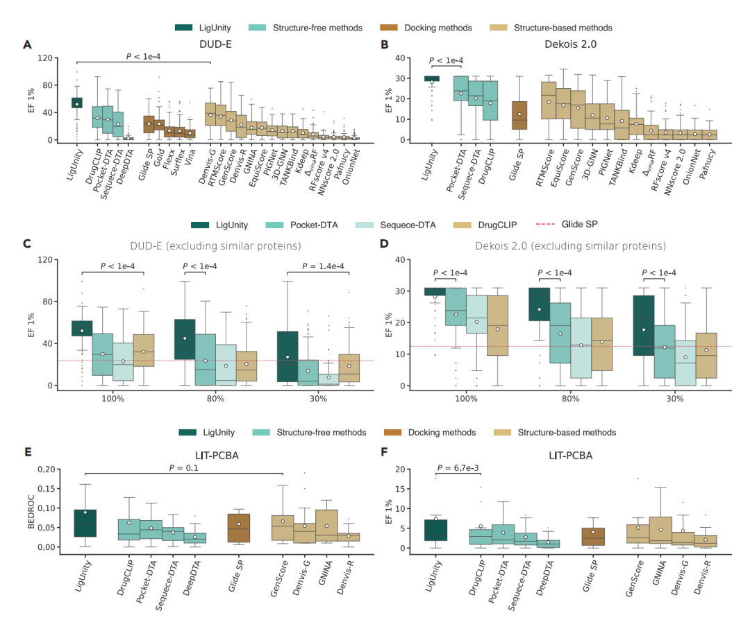 性能巨大提升:与表现最好的基线模型相比,LigUnity在关键指标“富集因子(EF 1%)”上取得了超过50%的性能提升(p < 10⁻⁹)。