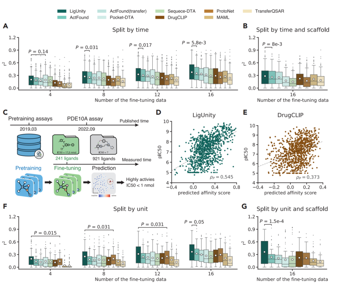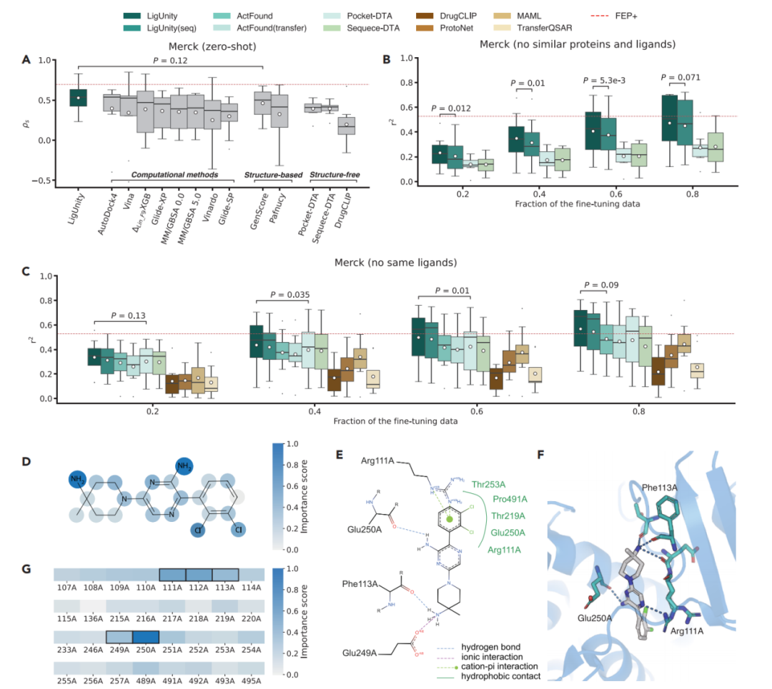 少量数据即可媲美“金标准”:当使用少量(10-20个)已知数据进行微调后,LigUnity的预测精度(在Merck基准上r² = 0.472)已接近计算成本极度高昂的物理计算“金标准”方法FEP+(r² = 0.528),为昂贵的实验和计算提供了高性价比的替代方案。
