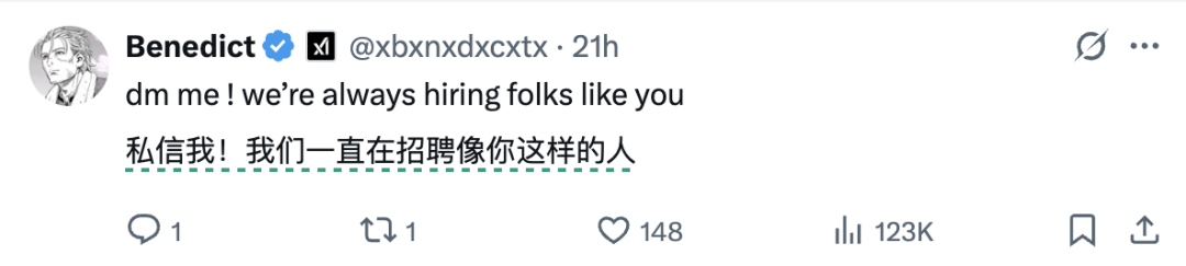 因为他在𝕏上表示“欢迎联系 :)”,引得部分网友调侃道:大佬应该财务自由了吧,还打啥工呢!