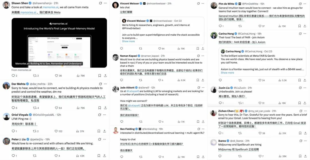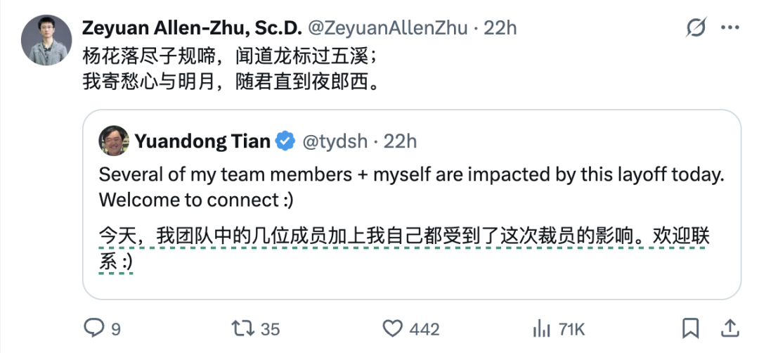 所以除了田渊栋组这类直接发社媒宣布自己bye-bye的人以外,连Meta内部员工也只能互相私底下交流,才知道谁走谁留。