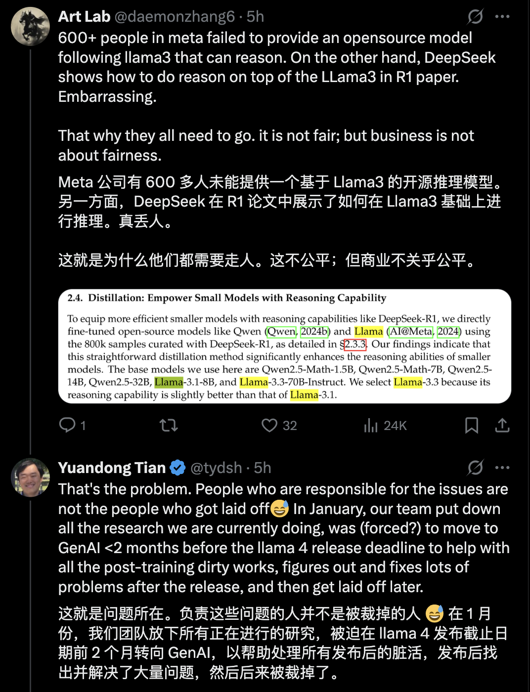 更抓马的是,很快就有爆料和“锐评”出现,认为这600人被裁是因为他们尸位素餐,搞不出一个基于Llama 3的推理模型,被DeepSeek狠狠打了脸。而且拉胯的Llama4,也需要有人负责。