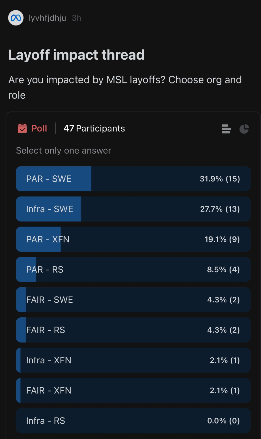 看了这47名前Meta人的投票结果有点意外,没想到产品应用研究和跨职能的岗位也会受到影响……