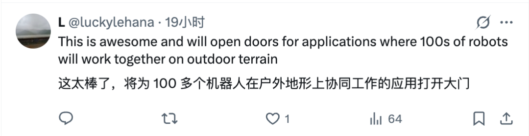 还有网友开始幻想让100个这样的机器人在户外协同工作了,那场景可了不得啊了不得: