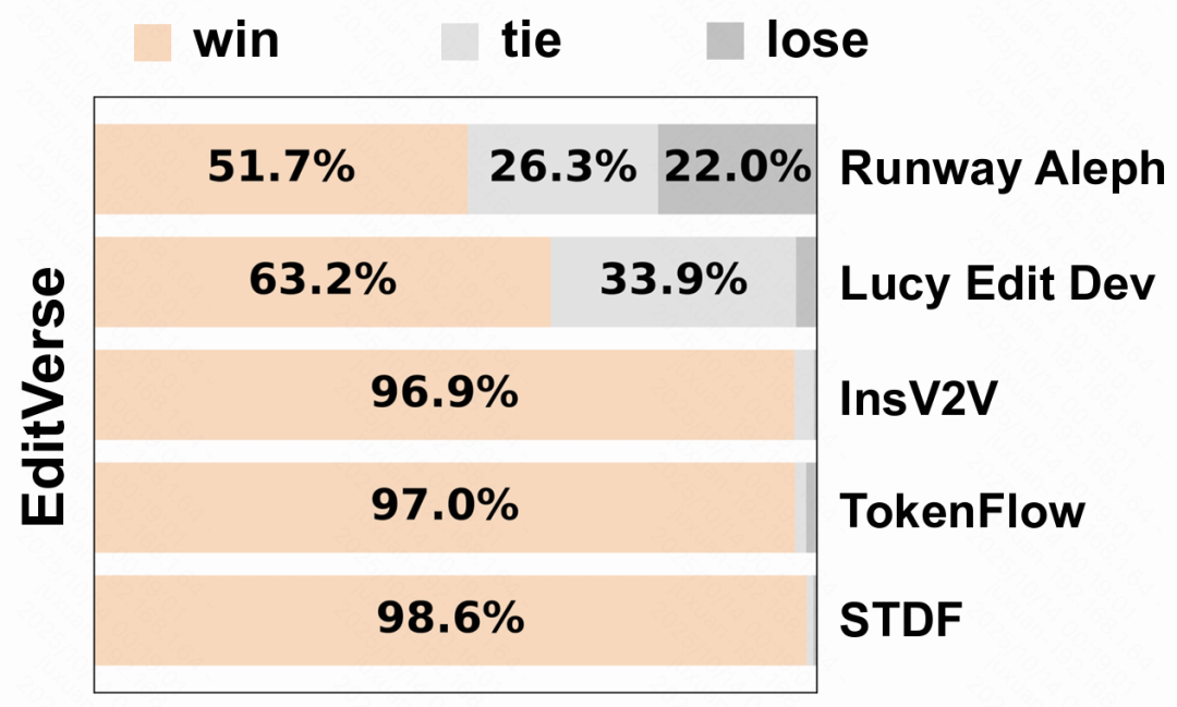 在编辑领域,用户的真实偏好最有说服力。在真人评测环节中,评测者在不知道模型来源的情况下,对不同模型生成的视频进行投票。