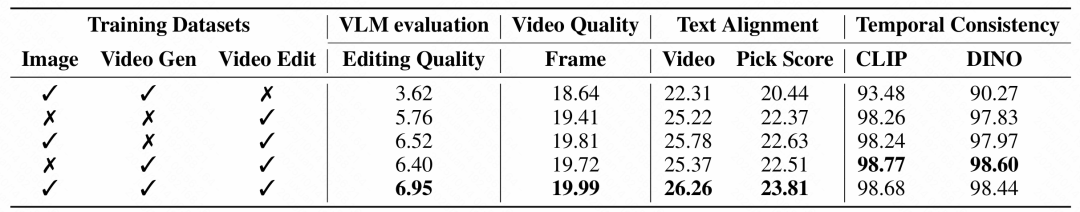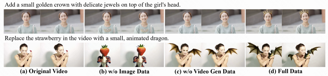 另外,团队还发现,如果将视频生成训练数据移除,模型效果同样会下降,这说明了模型是从图片编辑+视频生成两者各取其长,涌现出了视频编辑的能力。