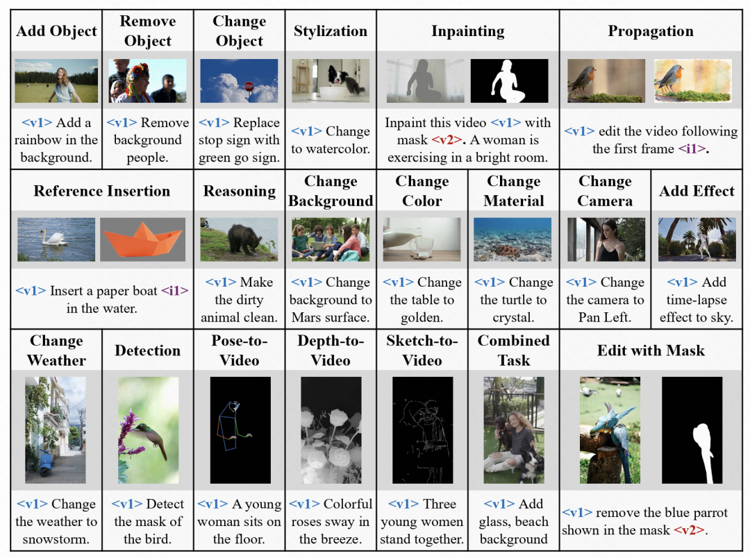 他们利用各种先进的专用AI模型,先自动生成海量的视频编辑样本(例如物体移除、风格转换等),然后通过一个视觉语言模型(VLM)进行打分和筛选,最终精选出23.2万个高质量的视频编辑样本用于训练 。