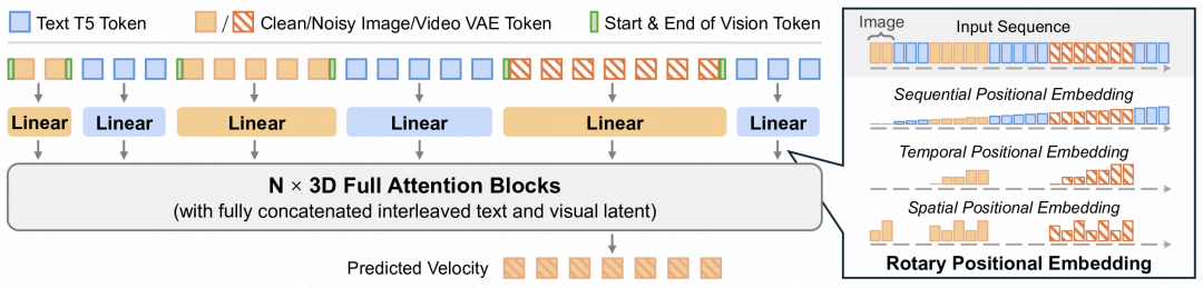 EditVerse 模型结构。研究人员设计了一个统一的图像和视频编辑与生成框架,将文本与视觉输入处理为统一的序列。图中右侧展示了位置信息编码设计(RoPE位置编码)。该框架利用全自注意力机制,以促进强大的上下文学习能力,并实现跨模态的高效知识迁移。