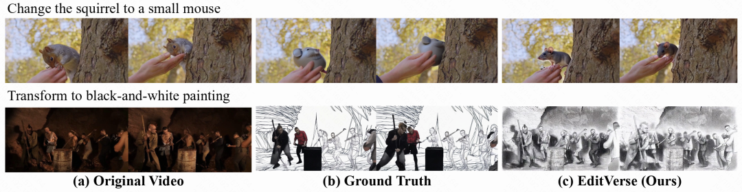 这批视频编辑数据,与600万图像编辑样本、390万视频生成样本、190万图像生成样本等海量数据混合在一起,共同训练EditVerse,从而使模型拥有更好的知识迁移理解能力。