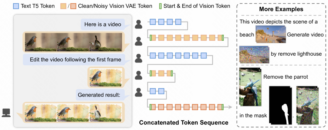 EditVerse交错文本与视觉模式的示例。EditVerse 能够处理任意分辨率、时长和顺序位置的图像与视频输入和输出。