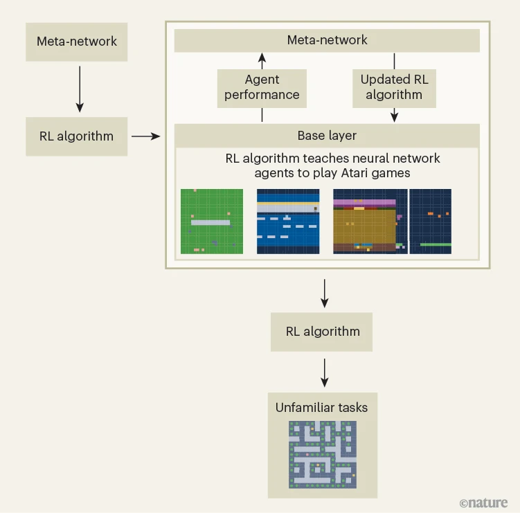 Oh及其同事开发了一种能发现新型强化学习算法的元学习算法。