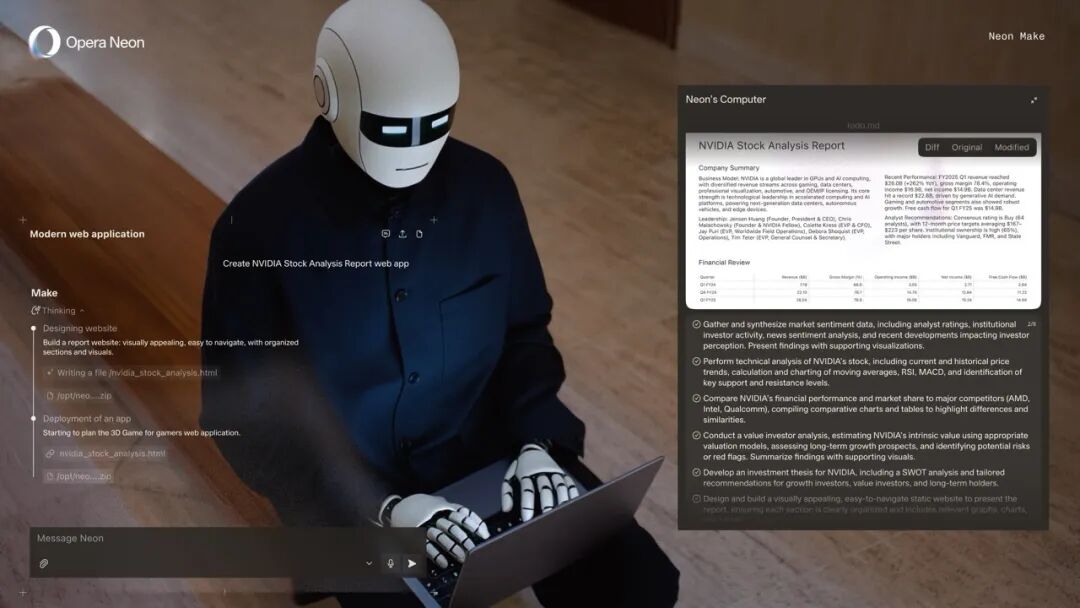 老牌厂商Opera也在9月推出Neon AI版,凭两项功能重新杀回战场: