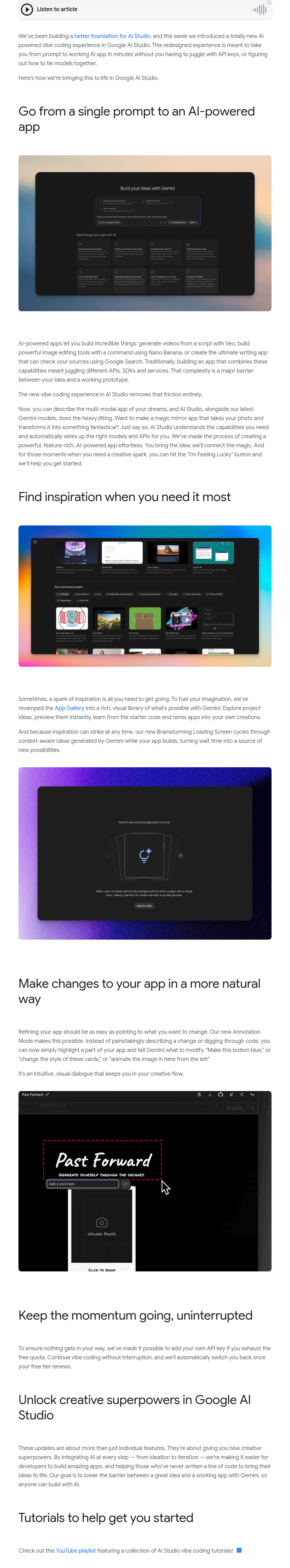 Google AI Studio 推出全新 AI 驱动的“氛围编程”体验,让用户从单个提示快速构建多功能 AI 应用。无需管理 API 密钥或整合不同模型,开发者可轻松将创意转化为原型。新功能支持结合 Veo 生成视频、使用 Nano Banana 进行图像编辑,或集成 Google Search 构建智能写作工具。该体验简化了多模态应用开发流程,大幅降低技术门槛,助力用户在几分钟内实现从想法到可用应用的跨越,提升开发效率与创造力。