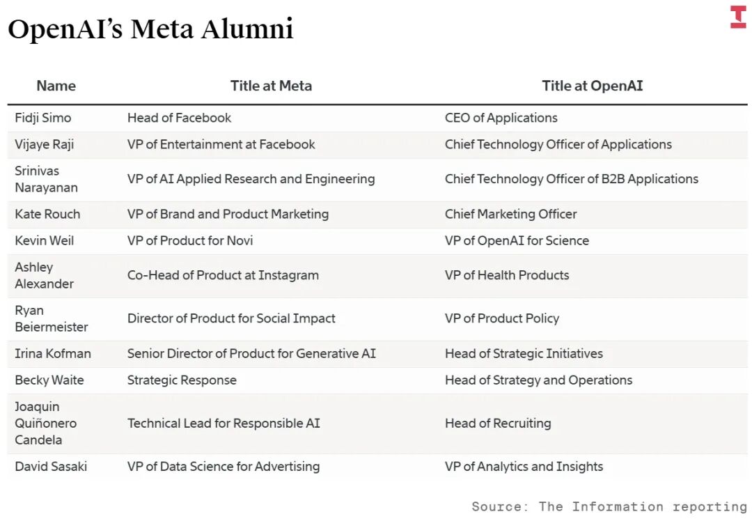 看看下面这张OpenAI目前的高管图,全是有Meta背景的人。