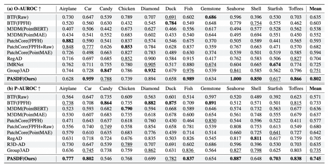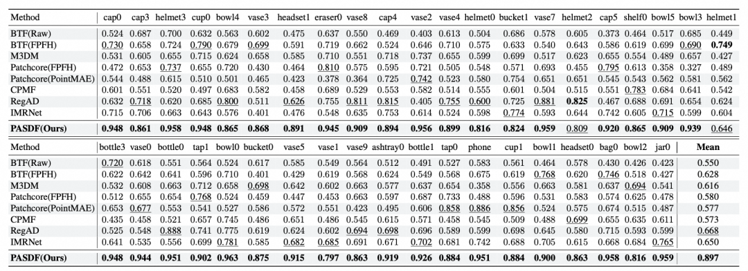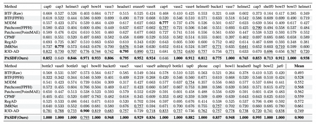 如表1所示,PASDF在Real3D-AD测试中取得了0.802的物体级AUROC(O-AUROC)平均分,和0.745的点级AUROC(P-AUROC)平均分,均领先所有对比方法。