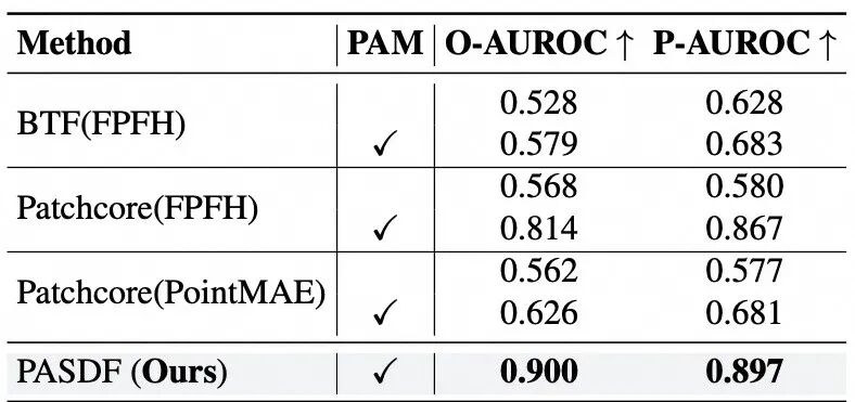 例如,将PAM集成到基于FPFH特征的BTF模型后,物体级(O-AUROC)和点级(P-AUROC)准确率分别提升9.7%和8.8%