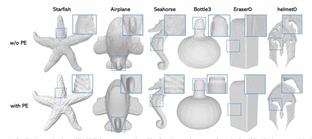 图3 PASDF重建结果的定性评估。前三列来自Real3D-AD数据集,后三列来自Anomaly-ShapeNet。w/o PE表示未使用位置编码的PASDF