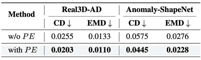通过对比有无位置编码的模型,定量指标显示未采用位置编码时,模型的Chamfer Distance和Earth Mover’s Distance明显升高(表5),形状重建质量大幅下降(图3)。
