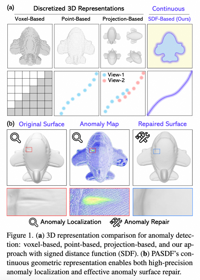 图1 (a)主流离散化点云表征方法与连续表征方法的对比(b)PASDF对异常部位的定位与修复
