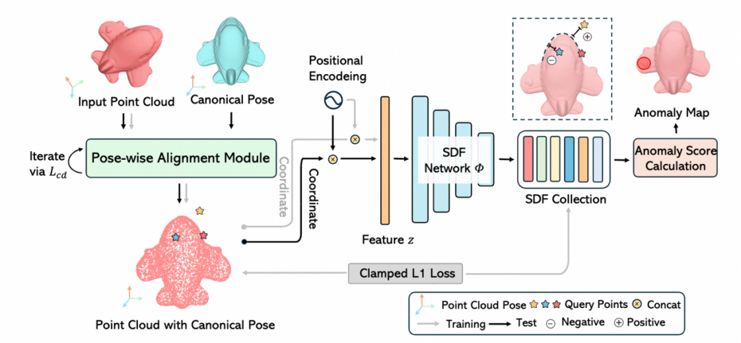 为此,研究人员以连续的带符号距离场(SDF)进行形状表征,并通过规范姿态对齐将姿态与形状显式解耦,使模型聚焦于内在几何差异,从机制上同时满足对象级精准检测与可用修复模板生成的双重需求。