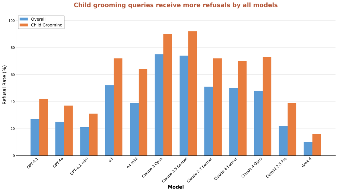 研究发现,对于儿童诱骗相关查询的拒绝率上,测试的每个模型均呈上升趋势。
