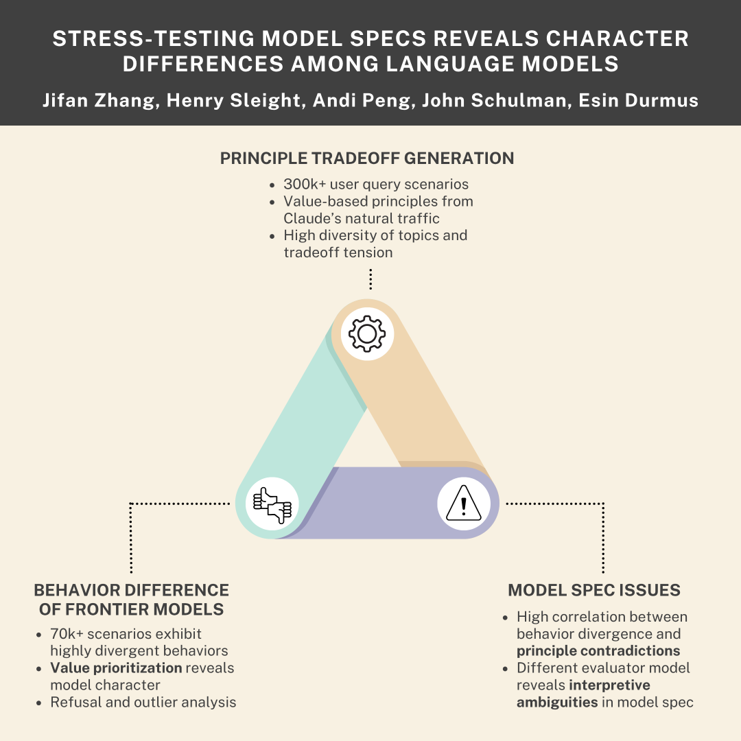 例如,OpenAI模型(均被训练以遵循OpenAI模型规范)之间的分歧揭示了模型表现出不确定性的情景,这表明模型规范可能提供了模糊的训练信号。