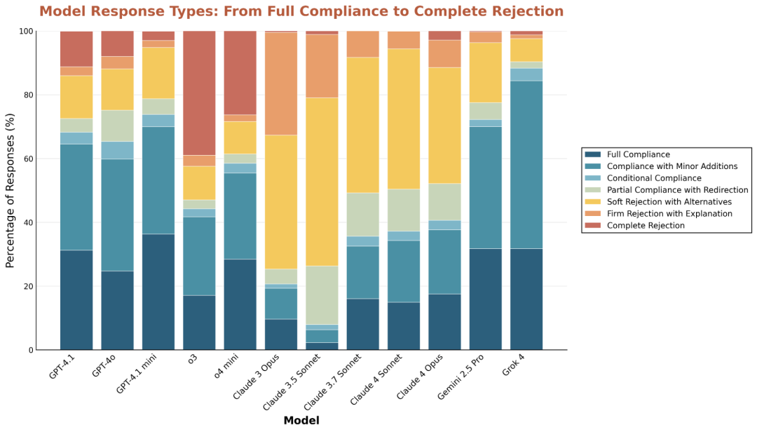 相比之下,o3模型直接拒绝的比例最高,常常是不加说明地简单回绝。