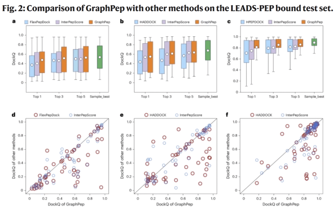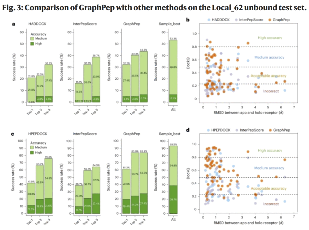 研究人员首先在 LEADS-PEP(bound/unbound) 与 Local_62(unbound/unbound) 基准集上,测试了 GraphPep 在 FlexPepDock、HADDOCK、HPEPDOCK 生成的诱饵集上的表现。