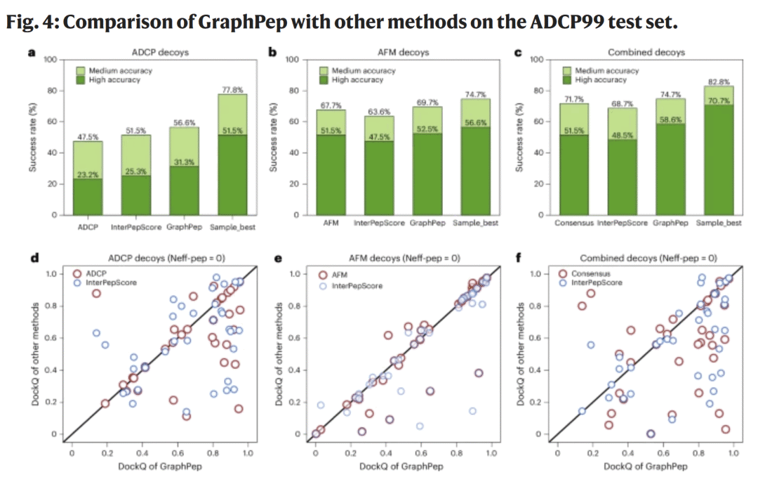 在 ADCP99 数据集 上,研究人员利用 ADCP 与 AlphaFold-Multimer (AFM) 生成诱饵集,对 GraphPep 进行测试。在 ADCP 诱饵集中,GraphPep 的中等精度与高精度成功率分别为 56.6% 与 31.3%,显著高于 ADCP (47.5%, 23.2%) 与 InterPepScore (51.5%, 25.3%)。在 AFM 诱饵集中,GraphPep 同样表现最优,并在共识评分策略下实现整体成功率 74.7%,高于所有比较方法。这些结果表明 GraphPep 具有较强的泛化能力,能在不同诱饵生成机制下稳定识别真实构象。