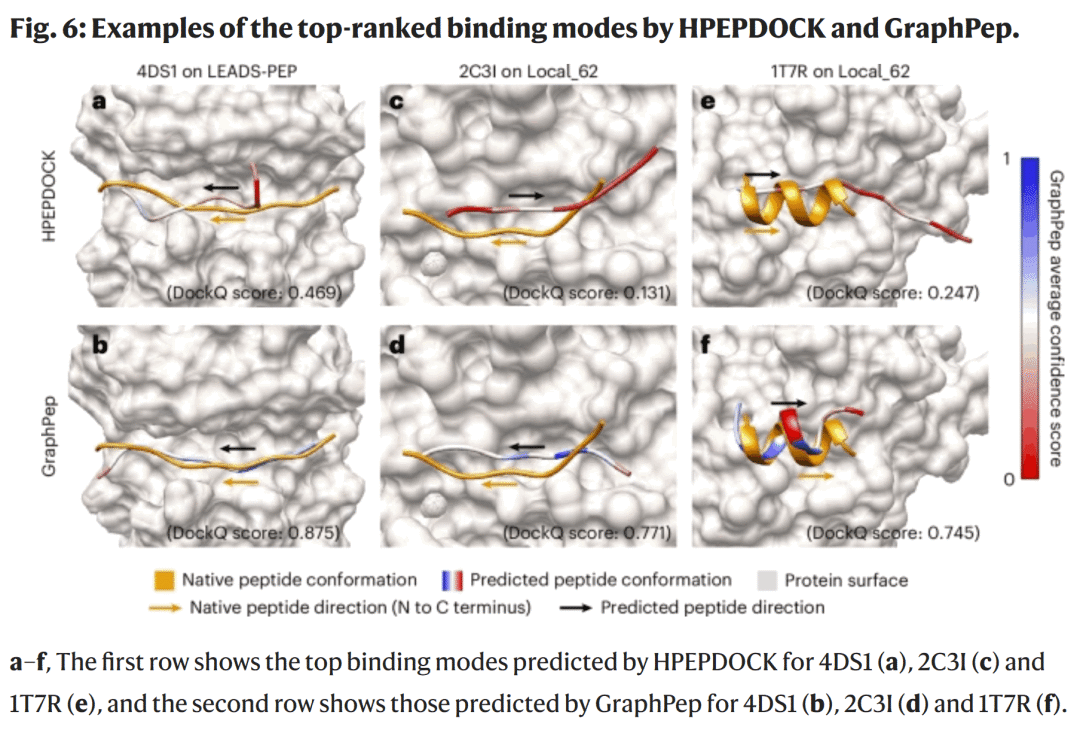 GraphPep 预测的结合构象与实验结构高度一致,能正确识别肽的方向、构象与二级结构类型。例如在 4DS1 中,GraphPep 的 DockQ 为 0.875,而 HPEPDOCK 仅为 0.469。此外,GraphPep 能为每对残基接触提供置信度评分,为后续结构优化提供指导依据。