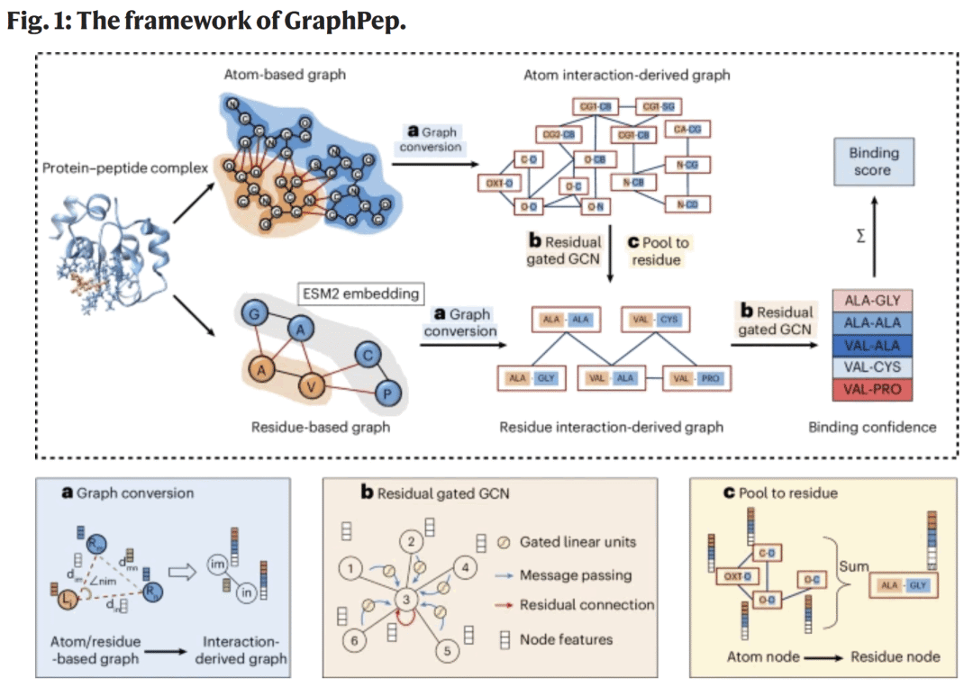 蛋白–肽相互作用在信号转导、免疫调控和药物设计中具有核心作用。准确预测蛋白–肽复合物的结合构象与结合亲和力,是理解分子识别机制和推动肽类药物开发的关键。研究人员提出了一种基于相互作用驱动的图学习框架——GraphPep,该框架能够从蛋白–肽复合物的三维结构中自动提取相互作用特征,并生成定量评分。GraphPep 通过构建相互作用图并利用层次图神经网络建模复合物界面的几何与能量特征。在多个独立基准数据集上,GraphPep 在结合能预测与构象评分任务中均显著优于现有方法,并展示出良好的可解释性与泛化性能。该框架可识别关键界面残基与能量热点区域,为基于结构的肽药设计提供新思路。