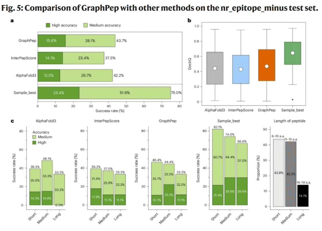 GraphPep 进一步在 nr_epitope_minus 抗体–肽复合物集 上验证性能。通过 AlphaFold3 强制采样生成的 121 组诱饵中,GraphPep 在中等与高精度标准下的成功率分别为 43.7% 与 15.6%,优于 AlphaFold3 原始评分与 InterPepScore。结果显示,随着肽长度增加,预测准确率下降,但 GraphPep 对短肽与中等长度肽的表现始终领先。在 DockQ 平均分上,GraphPep 为 0.469,较 AlphaFold3 (0.441) 与 InterPepScore (0.428) 均有提升。
