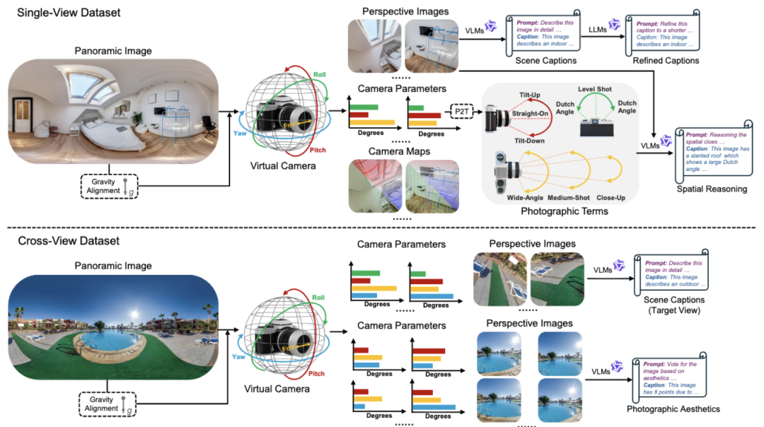三维世界受物理规律支配,重力与人工设计共同塑造了稳定的结构分布,为空间感知提供了强有力的先验。例如,天空、天花板、地面、沙滩等少纹理区域虽缺乏视觉特征,却蕴含着垂直方向的规律性,对俯仰角(pitch)估计至关重要。同样,视场角(FoV)的估计依赖于对空间构图的感知,包括前后景比例、物体尺度与深度分布等。虽然这些属性难以从纯视觉表征中直接推断,但多模态大模型已将其隐式地编码为知识先验。因此,团队将这些具备空间约束的视觉线索嵌入训练过程使用的“思维标签”(thinking captions)中,使模型能够对相机几何进行显式的空间推理。 - 专业级摄影术语: