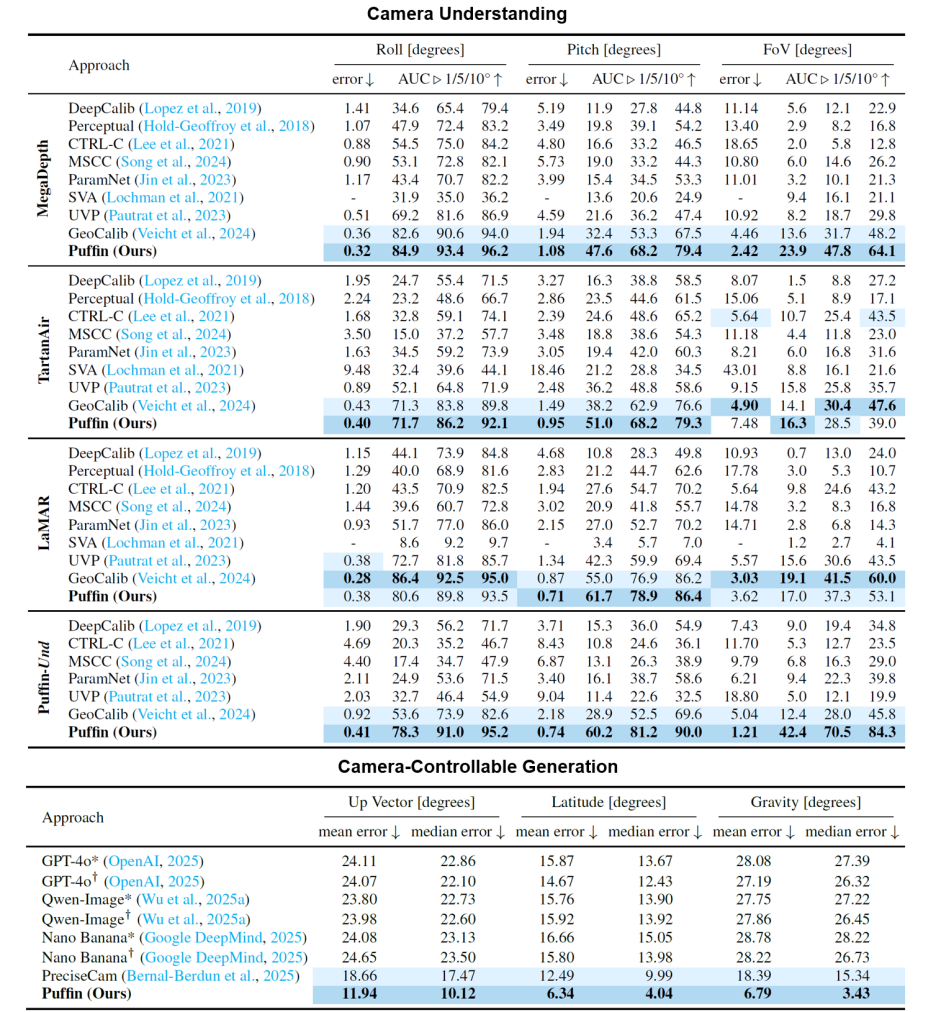 除了上述训练集以外,团队还构建了两个评测基准数据集:Puffin-Gen和Puffin-Und,分别为相机可控生成和相机理解提供更加具备挑战性和综合性的验证标准,均已开源。