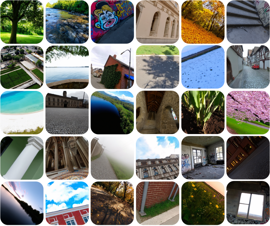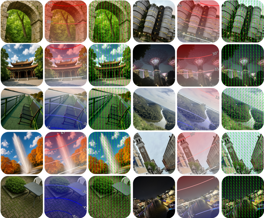 团队的相机理解结果及其相机透视场可视化如下:左侧为AIGC 图像(GTP-4o),右侧为真实世界的摄影图像。其中,相机透视场(latitude和up vector)由预测的相机参数转换得到。可以看出,团队的方法在各类场景中表现出不错的鲁棒性。
