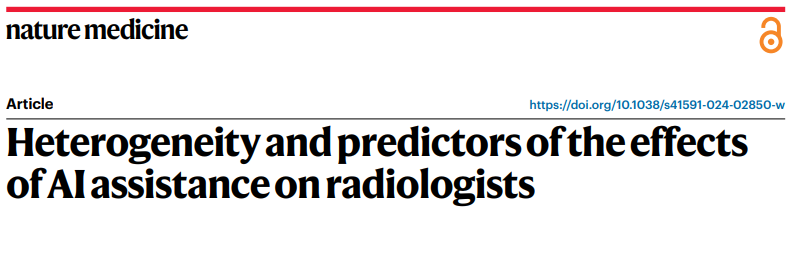 Nature Medicine 2024的一项大规模研究发现:当AI参与放射科胸片诊断时,医生的表现并不会随着「使用AI」而自动提升。