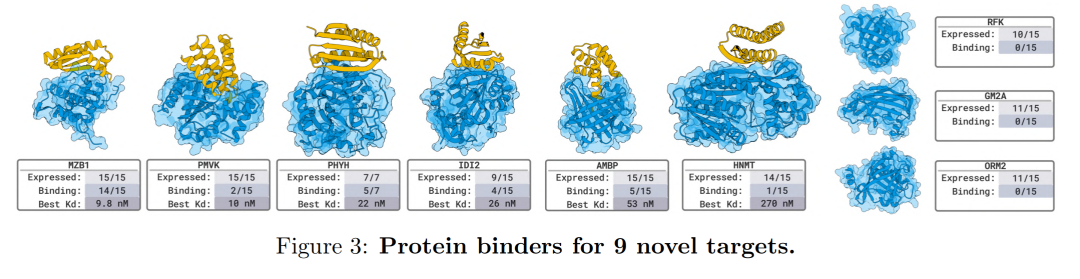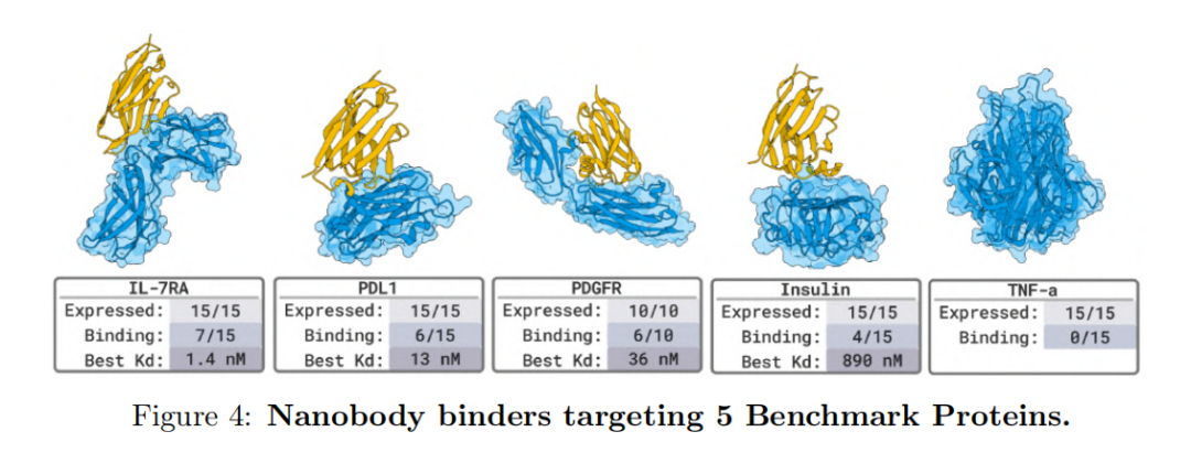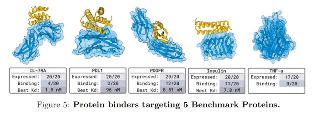 在 5 个包含已知结合结构的基准靶标测试中(如 PD-L1、TNFα、PDGFR 等),BoltzGen 同样取得高命中率——80% 的靶标出现纳摩尔级结合体,验证了其与当前最优模型持平的精度。