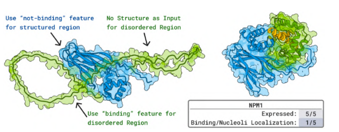 在针对多样结构的生物活性肽实验中,BoltzGen 设计的蛋白质能以纳摩尔至微摩尔(μM)级的亲和力结合不同类型的肽分子,并有效中和其抗菌或溶血活性。针对急性髓系白血病相关的无序蛋白 NPM1,模型生成的多肽在活细胞中表现出核仁共定位,提供了首个体内证据支持 AI 设计的蛋白可与天然无序蛋白结合。