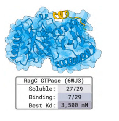 针对细胞代谢核心酶 RagC 和 RagA:RagC 二聚体的设计也获得显著结果:29 个候选肽中有 7 个成功结合 RagC,最高亲和力达 3.5 µM;环状二硫键肽设计则有 14 个显示出稳定结合。