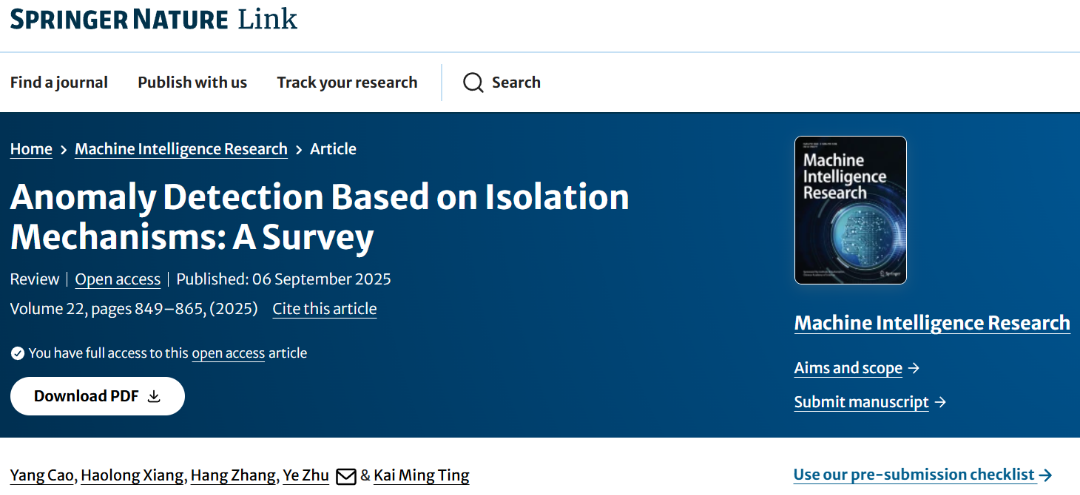 异常检测是一个长期活跃的研究领域,在金融、安全和制造等诸多领域有着广泛的应用。然而,在大数据时代,大规模、高维度和异构数据普遍存在,这对异常检测算法的效率和性能提出了挑战。基于孤立机制的无监督异常检测(Isolation-based unsupervised anomaly detection)是一种新颖且有效的数据异常识别方法。其核心思想是异常点数量少且与正常实例不同,因此可以通过随机划分被轻易地"孤立"出来。与现有方法相比,基于孤立机制的方法具有若干优势,例如计算复杂度低、内存占用少、可扩展性高、对噪声和不相关特征鲁棒,并且无需先验知识或繁重的参数调优。来自大湾区大学、清华大学、澳大利亚迪肯大学、南京信息工程大学及南京大学的研究者们综述回顾了最先进的基于孤立机制的异常检测方法,包括其数据划分策略、异常评分函数和算法细节。文章还讨论了基于孤立机制的方法在不同场景下的扩展与应用,例如在流数据、时间序列、轨迹和图像数据集中检测异常。最后,本文指出了基于孤立机制的异常检测研究面临的一些开放性挑战和未来方向。文章已发表于《机器智能研究(英文)》2025年第5期,全文开放获取。