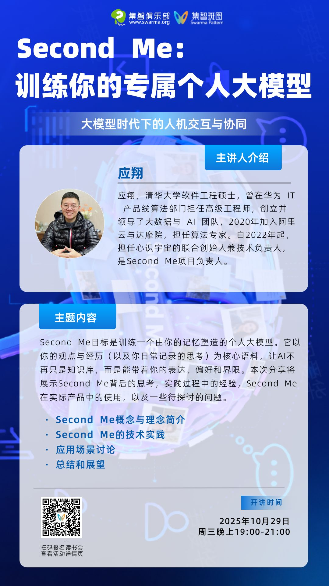 Second Me 目标是训练一个由你的记忆塑造的个人大模型。它以你的观点与经历(以及你日常记录的思考)为核心语料,让 AI 不再只是知识库,而是能带着你的表达、偏好和界限。本次分享将展示Second Me背后的思考,实践过程中的经验,Second Me在实际产品中的使用,以及一些待探讨的问题。