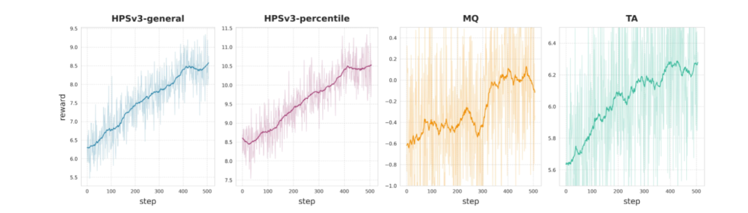 然后进行多奖励加权融合训练,避免单一奖励的过拟合和奖励欺骗问题,实现视觉、运动、对齐能力的均衡提升。